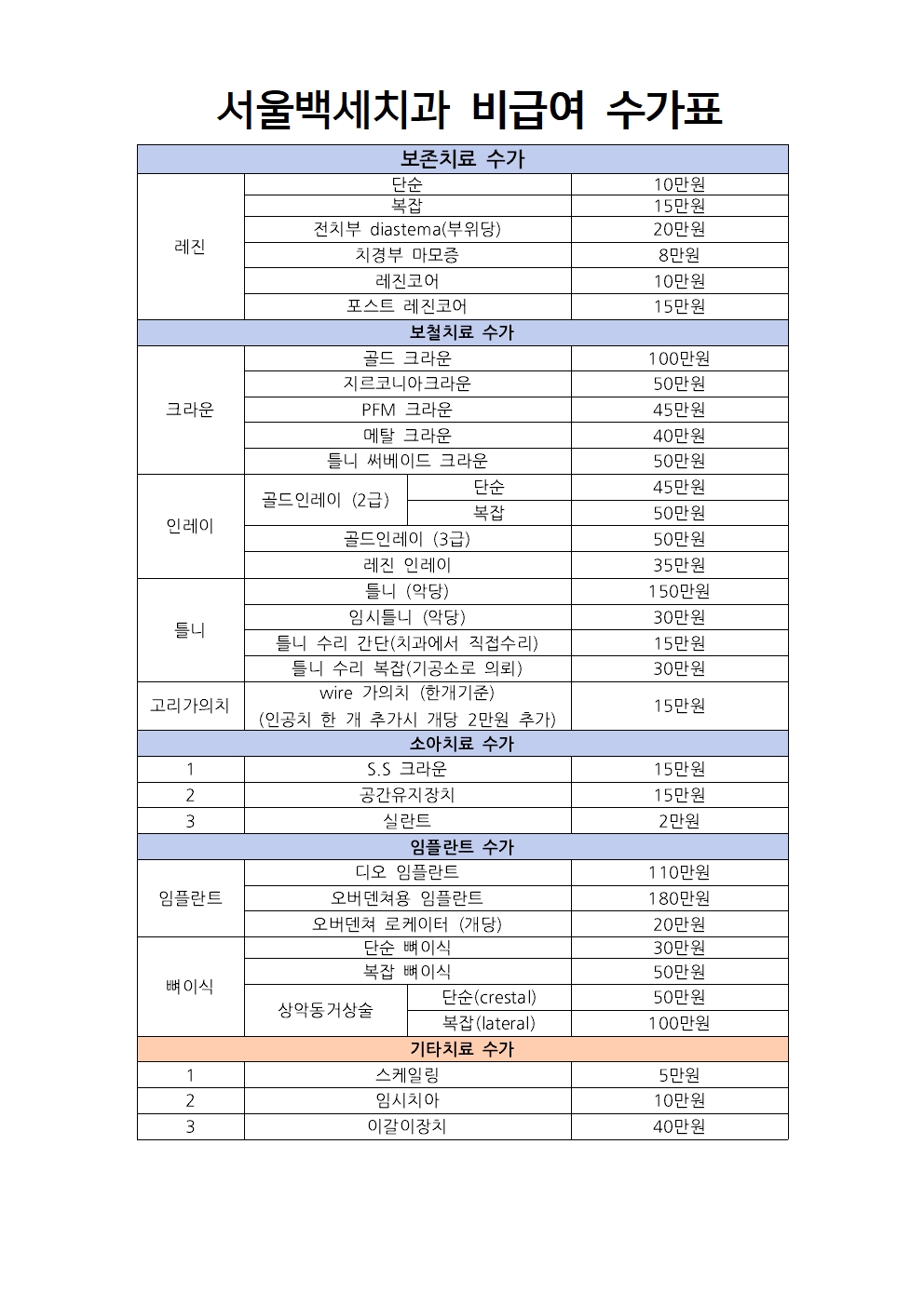 서울백세치과 비급여수가 및 제증명수수료 비용안내 (2025년)